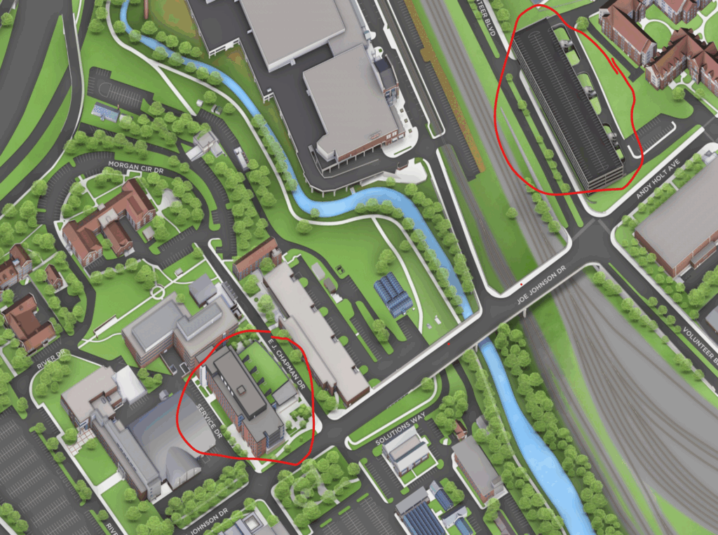 If you are not in a UT vehicle, we have parking permits for garage G7 for the morning event on April 30. To make the best use of these passes, we ask that you please carpool with other attendees. Please complete this form to get your digital parking permit: https://www.offstreet.io/events/643ARC2D. See the map below for the location of this parking area. UT vans will be used to bring participants to the Ag & Natural Resources Building on the UTIA campus or you may walk.
